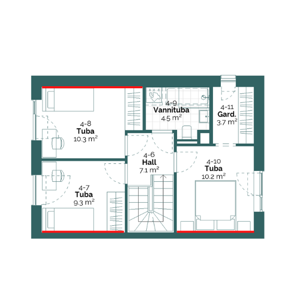 Valgusküllase neljatoalise kodu avar elutuba avaneb terrassile ja hoovialale, mis on ideaalne nii hommikukohvi nautimiseks, lastega mängimiseks kui sõprade võõrustamiseks. Suures magamistoas on aknaga walk-in garderoob, mis muudab riiete hoidmise mugavamaks ja magamistoa avaramaks. Lisaks suurele magamistoale on selles kodus kaks klassikalist magamistuba, kaks duširuumi (neist ühes esimesel korrusel ka leiliruum, millest otsepääs terrassile), eraldi tualettruum ning panipaik, mis pakub lisa hoiuruumi.